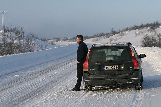 Norjan rajan ylitys sujuu sutjakasti, mutta sitten matkanteko vaikeutuu. Vaikka aurinko paistaa pilvettömältä taivaalta, kova tuuli pöllyttää raivokkaasti lunta tielle ja peittää hetkittäin näkyvyyden täysin. Lumi kasaantuu paksuiksi kinoksiksi melkein tukkien kapean vuoristotien. Onneksi ketään ei tule vastaan. Tai ei oikeastaan onneksi - parinkymmenen kilometrin päässä selviää, että vastaantuleva liikenne on estetty puomilla, ja ajaa voi vain yhteen suuntaan kerrallaan. Paluumatkalla sama osuu omalle kohdalle, ja matkanteko keskeytyy tunniksi.