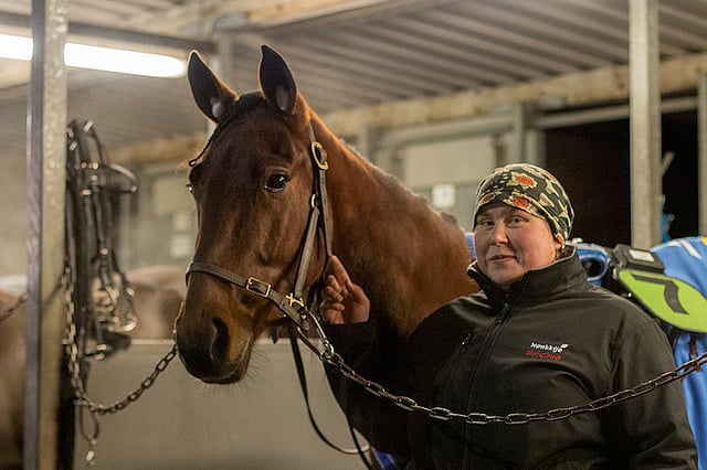 Lähtönsä kuopus Rafa Parera on parhaillaan lämmityksessä illan viimeistä T65-kohdetta varten. Sen hoitaja Marika Salin kertoo varsan olevan edelleen hyvässä kunnossa, pirteä ja iloinen.