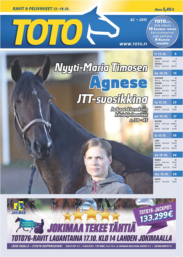 TOTO-lehdessä on 10 Suomen ravien käsiohjelmasivut, muun muassa Jokimaan lauantain T76-jackpotkierrokselle, sekä pelilistat 4 Ruotsin raveihin: tiistain Axevallan T64-kohteet, keskiviikon Solvallan ja Jägersron sekä lauantain Örebron T75-ravien kaikki lähdöt.