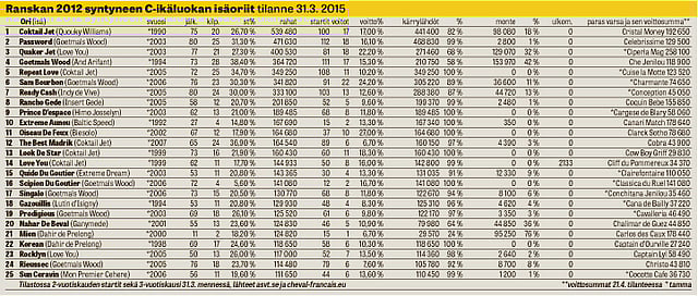 Ranskan moninkertainen championi Coktail Jet on 25-vuotiaana edelleen huipulla. Kaksivuotiaina sen varsoista sekä Cristal Money että Campo Rossa tienasivat yli 100 000 euroa, ja tänä vuonna TOP-10:een mahtuu Cristal Moneyn lisäksi montéssa pärjännyt Corsica.