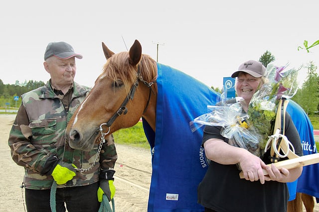 “Metsähevosena tämä on erittäin hieno, ja herkkä ohjastaa. Hevonen vähän narrasi minua, kotona en olisi tätä uskonut. Kotona pakkikin jäi puuttumaan, mutta nyt se pakitti oikein nätisti”, ohjastaja Eino Leikas kertoi voittajasta.