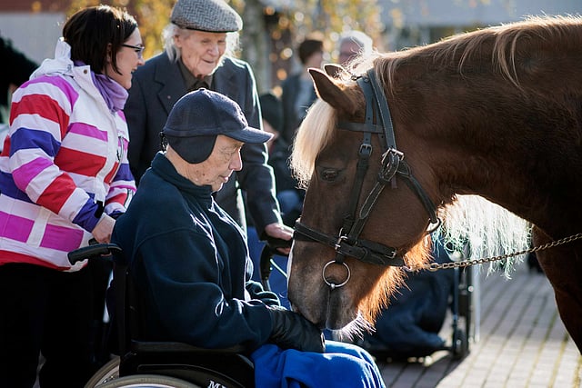 Tämä on tietysti juhlahetki, sillä hevosen saapumista Ypäjän Hevosopistolta Lamminniemen Hyvinvointikeskukseen on odotettu pitkään. Lamminniemessä asuu parikymmentä sotaveteraania, ja kuntoutuksessakin heitä käy siellä säännöllisesti vielä melkoinen joukko.