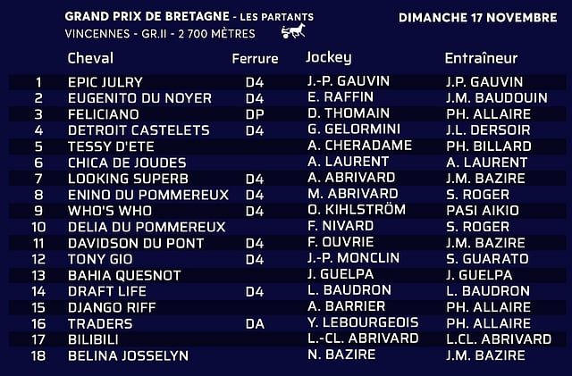 Ruotsalaishevosia nähdään Bretagnessa vain yksi. Pasi Aikion Who's Who on matkannut Grosboisin valmennuskeskukseen. Örjan Kihlström ajaa Maharajahin poikaa. Aikion ajatuksia voi lukea perjantain Hevosurheilusta. Prix d'Amériquen voittaja Bélina Josselyn on yksi kovista ranskalaisista. Nicolas Bazire nähdään tamman kärryillä, kun Jean-Michel Bazire on kilpailukiellossa. Pohjoismaista väriä tuo myös norjalainen Looking Superb, joka tulee Baziren tallista.