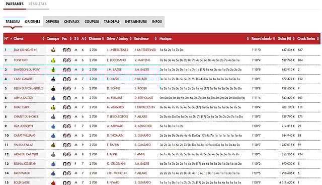Jean-Michel Bazirella on kaksi hevosta viivalla: Davidson du Pont ja Belina Josselyn. Baziren ainoa voitto on vuodelta 1999 tamma Fiesta d'Anjoulla. Ori Capitole on ainoa kolminkertainen voittaja vuosina 1995, 1997 ja 1998. Nopeimman voittotuloksen 12,5/2700m on tehnyt Roxanne Griff vuonna 2012. Guaraton tammaa ajoi Eric Raffin.