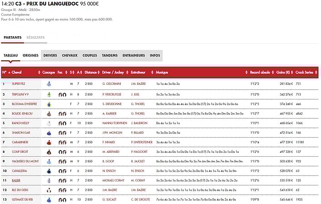 Jean Michel Bazire istuu itse Ble du Gersin kyytiin, hänen toista valmennettavaansa Super Feziä ajaa Gabriele Gelormini. Kilpailumatka Prix du Languedocissa on 2850 metriä Vincennesin pitkällä radalla. Palkintopotti on 95 000 euroa, josta voittajan osuus on 42 750 euroa.