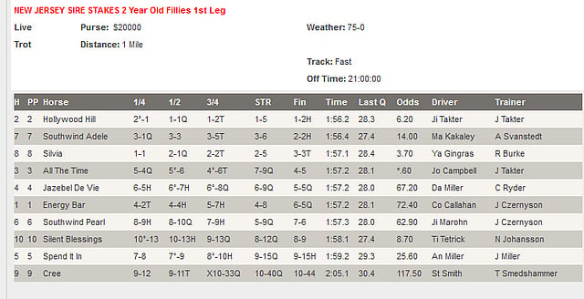 Kaikkiaan Meadowlandsissa kilpailtiin neljä NJSS -kaksivuotislähtöä, kaksi oriille ja kaksi tammoille.