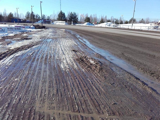 "Alkuviikko ajettiin routaa pois. Keskiviikkona satoi räntää, ja se toi hieman takapakkia. Kun routa oli saatu pois, rataa alettiin tiivistämään rengaslanalla ja verkkolanalla. Huomiselle saadaan hyvä pinta. Siinä voi kilpailla kaikilla balansseilla", Hytönen lupaa.