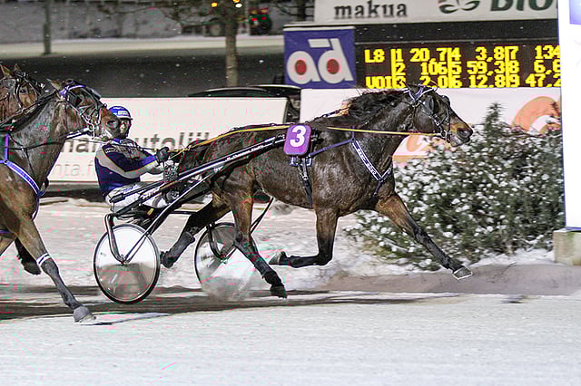 Esa Holopaisen tällä kertaa ajama ikiliikkuja Bret Boko torjui vastustajansa Teivon maililla tasaisen reippaasta matkavauhdista huolimatta. Shadow Of Brisbane meni peitsin kautta laukalle kesken voittotaiston. Kuva: Roosa Lindholm.
