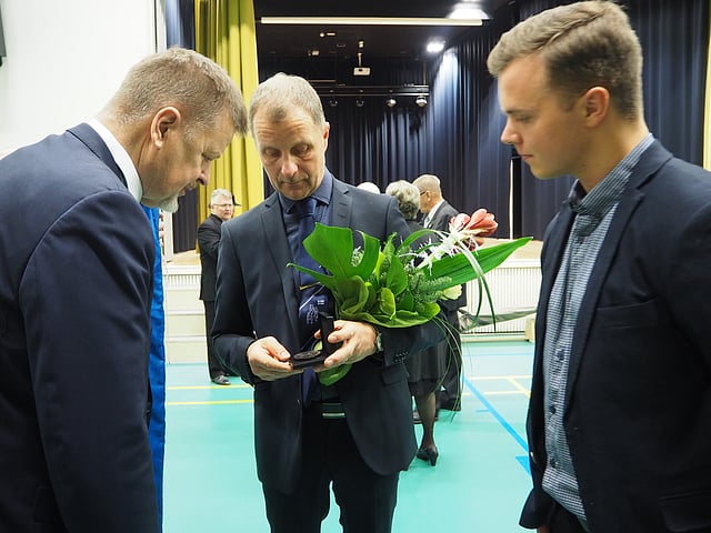 ”Hollola on hyvä kunta ja sillä on hyvä sijainti. Sekin on auttanut siihen, missä nyt tällä hetkellä ollaan. Olen ylpeä tästä kunnianosoituksesta”, huomiosta yllättynyt Holopainen kiitteli juhlayleisön edessä.