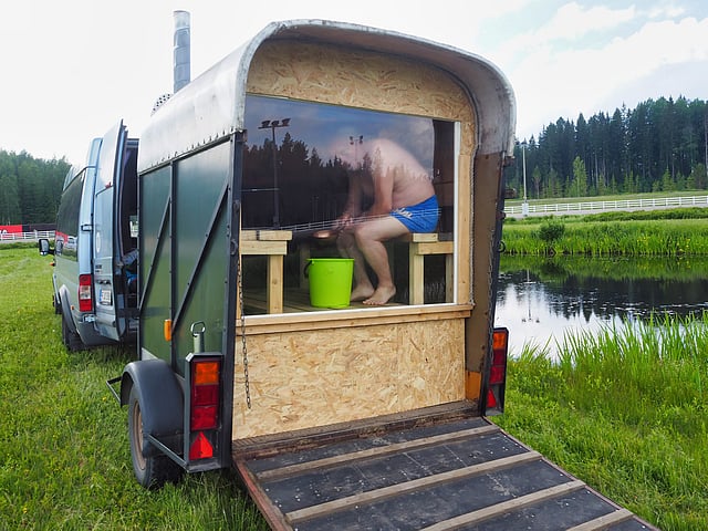 Timo Jakola parkkeerasi ratajohdon luvalla erikoissaunansa Jokimaan raviradan lammen viereen ja lämmitti sen puukiukaan ensimmäistä kertaa. Jo puolessa tunnissa siitä irtosi mukavan leppeät ja pehmeät löylyt.