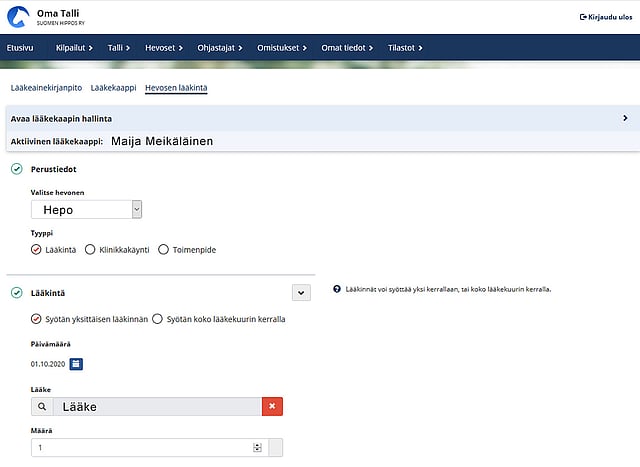 Järjestelmä löytää henkilön omistamat, valmentamat ja hoitamat hevoset, ja siihen voi hevoskohtaisesti kirjata hevoselle annetut lääkkeet ja lääkekuurit.
