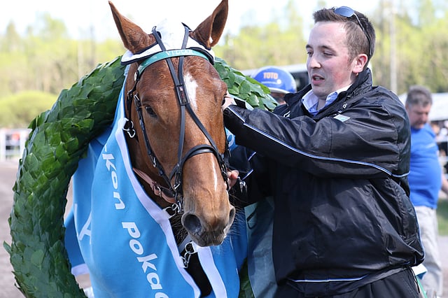 Hevosen valmentaja Jalmari Svart oli onnensa huipulla.