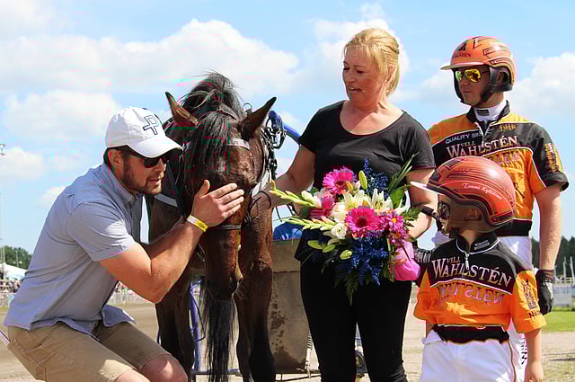 Jarno ja Minna Kauhasen ruuna saapui ihasteltavaksi ja porkkanoilla palkittavaksi radalle vakio-ohjastajansa Tommi Kylliäisen ja tämän pojan, Niklas Kylliäisen kanssa.