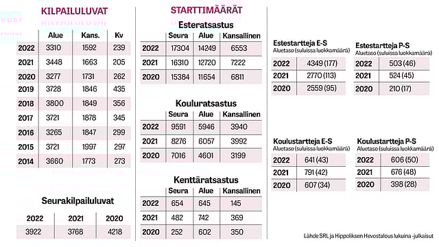 Viimeistä kolmea erikoisvuotta vertailtaessa esteiden seuratason startit ovat nousseet melkein 2 000 kappaleella ja esteiden aluestartit 2 600 kappaleella verrattuna koronan runtelemaan vuoteen 2020. Silloin keväällä ei kilpailtu lainkaan, ja jatkossakin rajoituksia oli. Viime vuodesta aluestarttien määrä on noussut 1 529 startilla. Sen sijaan kansallisten starttien määrä on vähentynyt vuodesta 2021 669 startilla.