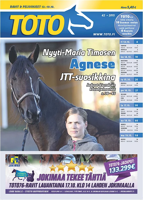 TOTO-lehdessä on 10 Suomen ravien käsiohjelmasivut, muun muassa Jokimaan lauantain T76-jackpotkierrokselle, sekä pelilistat 4 Ruotsin raveihin: tiistain Axevallan T64-kohteet, keskiviikon Solvallan ja Jägersron sekä lauantain Örebron T75-ravien kaikki lähdöt.