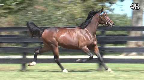 Gimpanzeen 800 000 dollaria maksanut tytär Kadena viilettää Huntertonin varsavideolla. Kuvankaappaus:Best Damn Horse Videos
