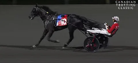Canadian Trotting Classicin voittaja Amazing Catch ohjissa Dexter Dunn.Kuva: Kuvakaappaus Mohawk Park video