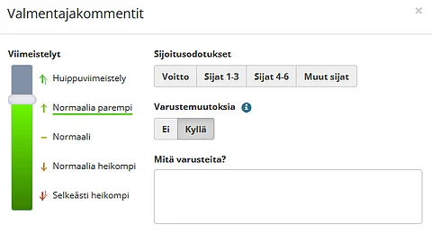 Liukukytkimillä annettu tieto tulee saman tien nähtäväksi Mobiilihepan lähtölistoihin ja hevoskohtaisiin kilpailutietoihin. Sanallisten arvioiden kirjoitusasu tarkastetaan Hippoksessa ennen niiden julkaisemista, joten tekstien ei tarvitse olla valmiiksi loppuun hiottuja.
